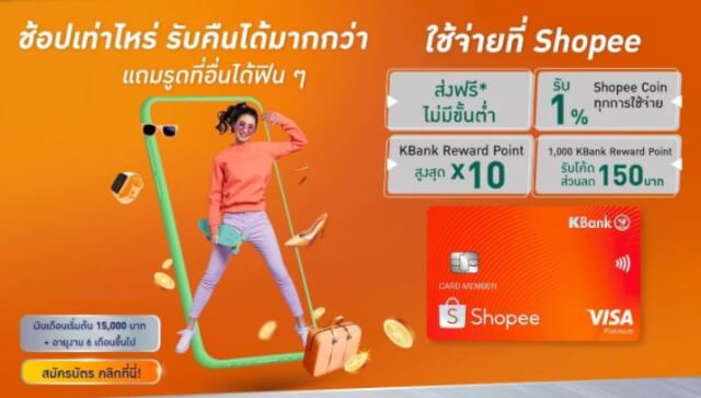 - บัตรเครดิตธนาคารกสิกร Shopee ทุกการใช้จ่าย ณ Shopee รับ Kbank Reward สูงสุดถึง 10 เท่า
