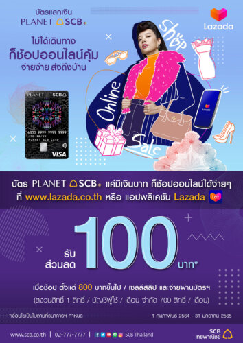 บัตร SCB Planet เพียงแค่มีเงินบาท ก็สามารถช้อปปิ้งออนไลน์ได้อย่างง่ายดาย ณ ww.lazada.co.th หรือ Lazada APP พร้อมรับส่วนลด 100 บาท เมื่อทำการช้อปปิ้งตั้งแต่ 800 บาทขึ่้นไป / เซลล์สลิป  (*สงวนสิทธิ์ 1 ท่าน /โค้ด/เดือน จำกัดสิทธิ์ 700 สิทธิ์ ต่อเดือน)