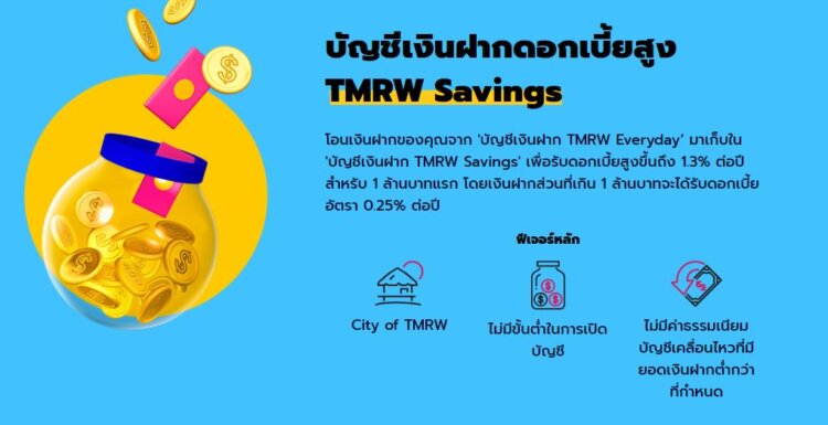 • TMRW Savings รับดอกเบี้ยสูงถึง 1.3% ต่อปี โดยไม่มียอดขั้นต่ำและไม่จำเป็นที่จะต้องฝากประจำ