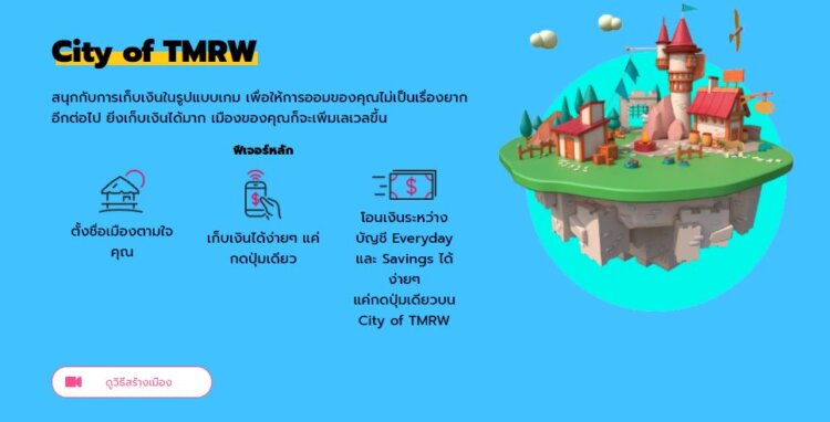 • TMRW Savings สนุกกับการเก็บเงินในรูปแบบของเกม City of TMRW ช่วยสร้างแรงจูงใจให้ถึงเป้าหมายได้อย่างง่ายดายมากยิ่งขึ้น