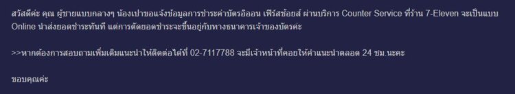 เจ้าหน้าที่ของทางเซเว่น (7-11) ได้ให้ข้อมูลที่น่าสนใจว่า สำหรับการจ่ายบิลบัตรเครดิตอิออน (Aeon) ผ่านเคาน์เตอร์กับทางเซเว่นนั้น การอัพเดทข้อมูลจะเป็นแบบออนไลน์ ทำให้สามารถนำส่งยอดได้ในทันที โดยความรวดเร็วในการตัดยอดชำระนั้นจะขึ้นอยู่กับทางธนาคารของเจ้าของบัตรด้วยเช่นกัน ดังนั้น ถ้าหากใครกำลังอยากที่จะจ่าบิลของยบัตรเครดิตอิออน (Aeon) ผ่านทางเซเว่น ก็น่าจะสร้างความสบายใจให้พอสมควรว่าจะยอดจะได้รับการอัพเทอย่างรวดเร็วทันใจอย่างแน่นอน