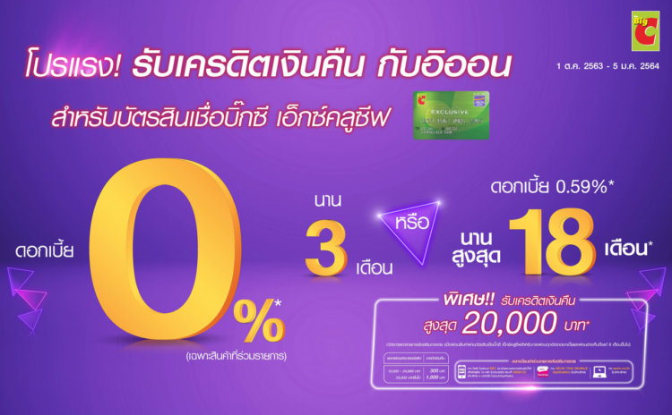 พิเศษ เฉพาะบัตรสินเชื่อบิ๊กซี เอ็กซ์คลูซีฟ ผ่อนชำระเครื่องใช้ไฟฟ้า หรือโทรศัพท์มือถือ ดอกเบี้ย 0% นาน 3 เดือน หรือ 0.59% นานสูงสุด 18 เดือน พร้อมรับเครดิตเงินคืนสูงสุด 20,000 บาท/บัตร/ตลอดระยะเวลารายการส่งเสริมการขาย* ณ บิ๊กซี ทุกสาขาทั่วประเทศ