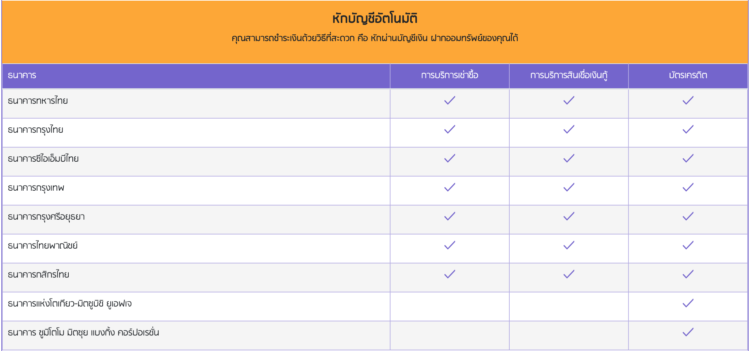 เคาเตอร์ธนาคารอื่น ๆ หรือหักโดยตรงจากบัญชีออมทรัพย์หรือตู้ATMธนาคารด้านล่างนี้