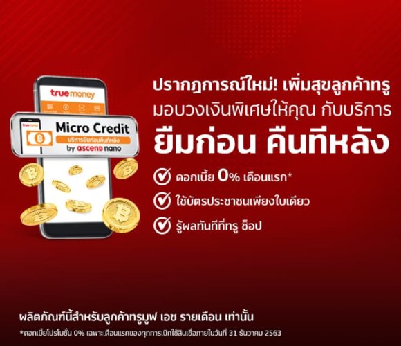 • วงเงินกู้สูงสุด 10,000 บาท (*สำหรับลูกค้าทรูมูฟเอช ระบบรายเดือนที่มีประวัติการชำระค่าบริการที่ดี)