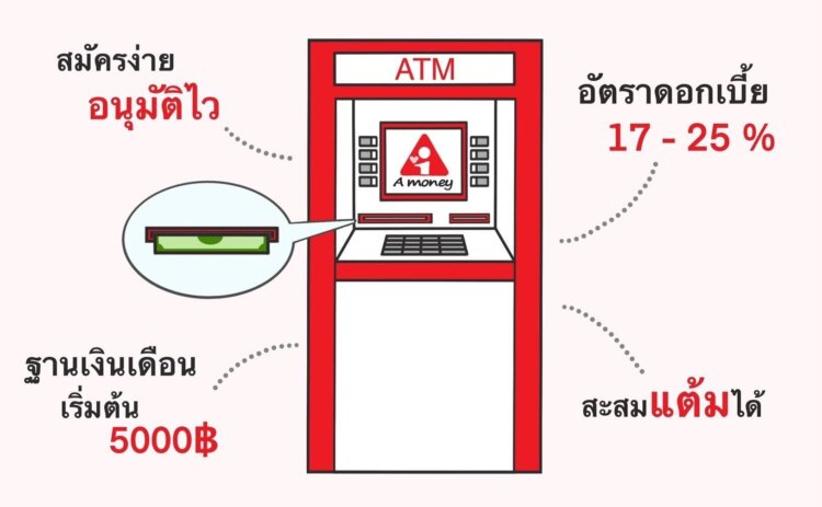 บัตรกดเงินสด A money เป็นบัตรกดเงินสดที่มอบวงเงินสำรองในโอกาสพิเศษหรือยามฉุกเฉินที่ยอดเยี่ยมที่สุด เพราะเป็นบัตรที่ทุกคนสามารถเข้าถึงได้จากการกำหนดฐานเงินเดือนในการสมัครขั้นต่ำเอาไว้เพียง 5,000 บาทเท่านั้น นอกจากนี้ บัตรกดเงินสด A money ยังมีสาขาอยู่ทั่วประเทศ สามารถติดต่อเพื่อทำการสมัครหรือสอบถามข้อมูลได้อย่างง่ายดายอีกด้วย